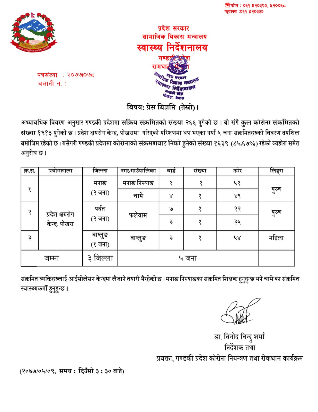 गण्डकी प्रदेश स्वास्थ्य निर्देशनालयका अनुसार प्रदेशका ३ जिल्लाका  ४ पुरुष र १ महिला गरी थप ५ जनामा  मंगलबार  दिउसो सक्रमण पुष्टि भएको हो ।