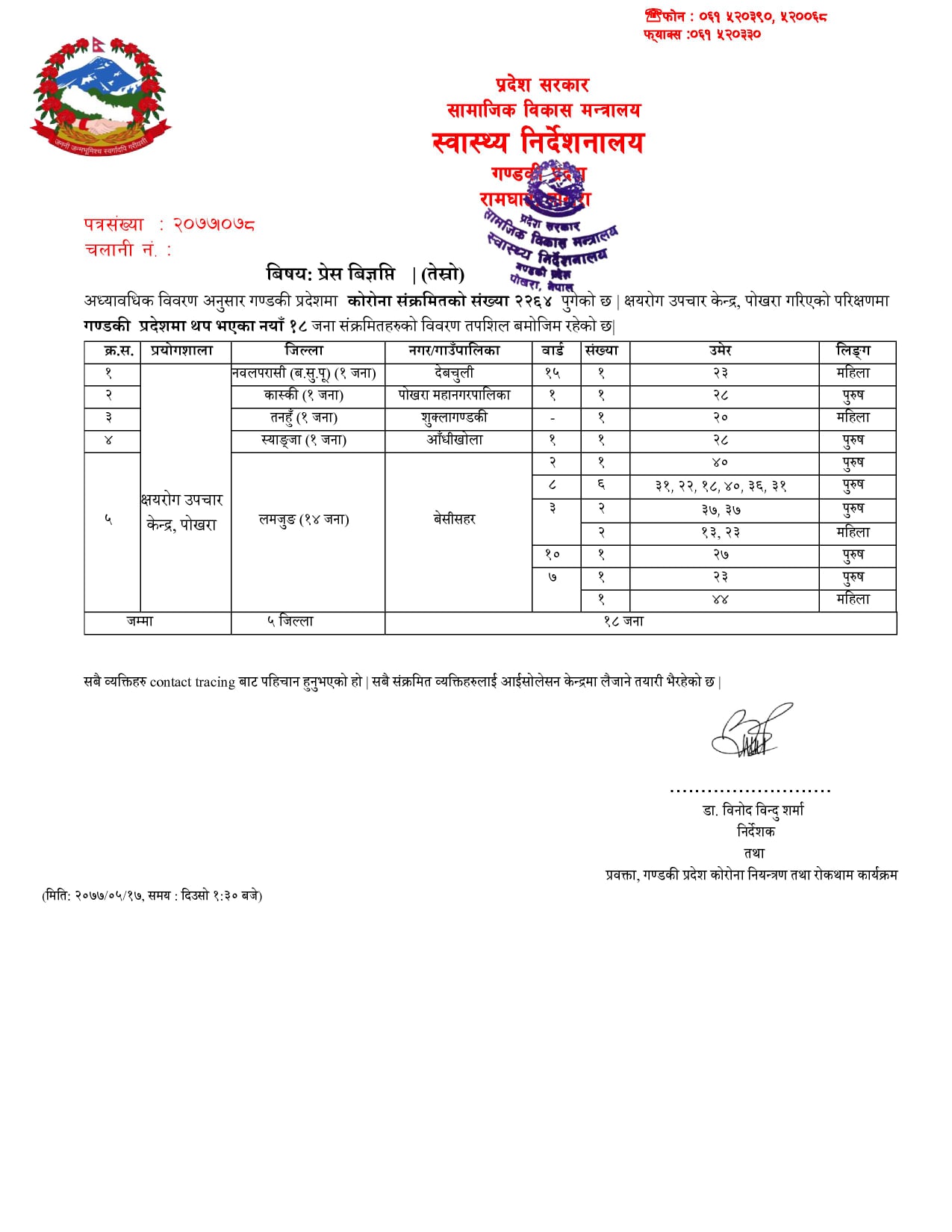 संक्रमण पुष्टि हुनेमा तनहुँ शुक्लागण्डकी की २० वर्षीया महिला , स्याङजा आधिखोलाका २८ वर्षीय पुरुष र नवलपुर देवचुलीकी २३ वर्षीया महिला रहेको निर्देशनालयले जनाएको छ ।