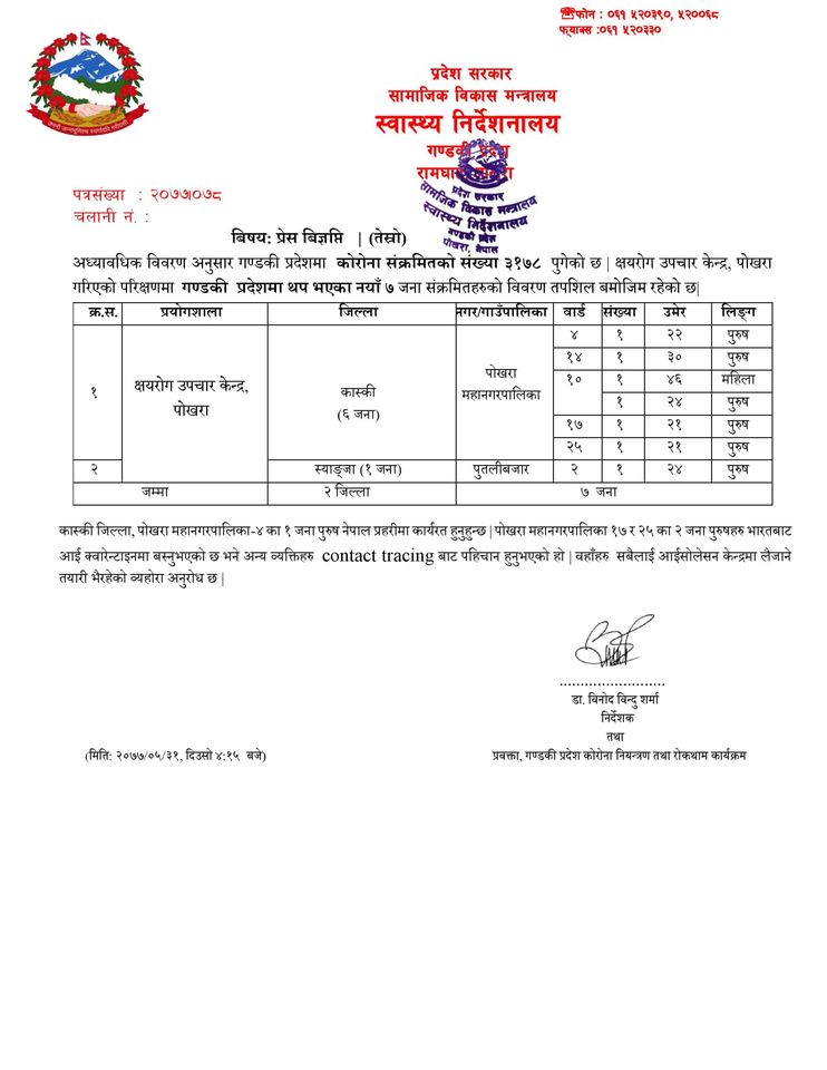 निर्देशनालयले बुधबार तेस्रो विज्ञप्ति मार्फत पोखरा महानगरका ४, १०, १४, १७ र २५ वडाका ५ पुरुष तथा एक महिला र स्याङजा पुतलिबजार २ का २४ वर्षीय पुरुषमा कोरोना देखिएको जनाएको हो ।