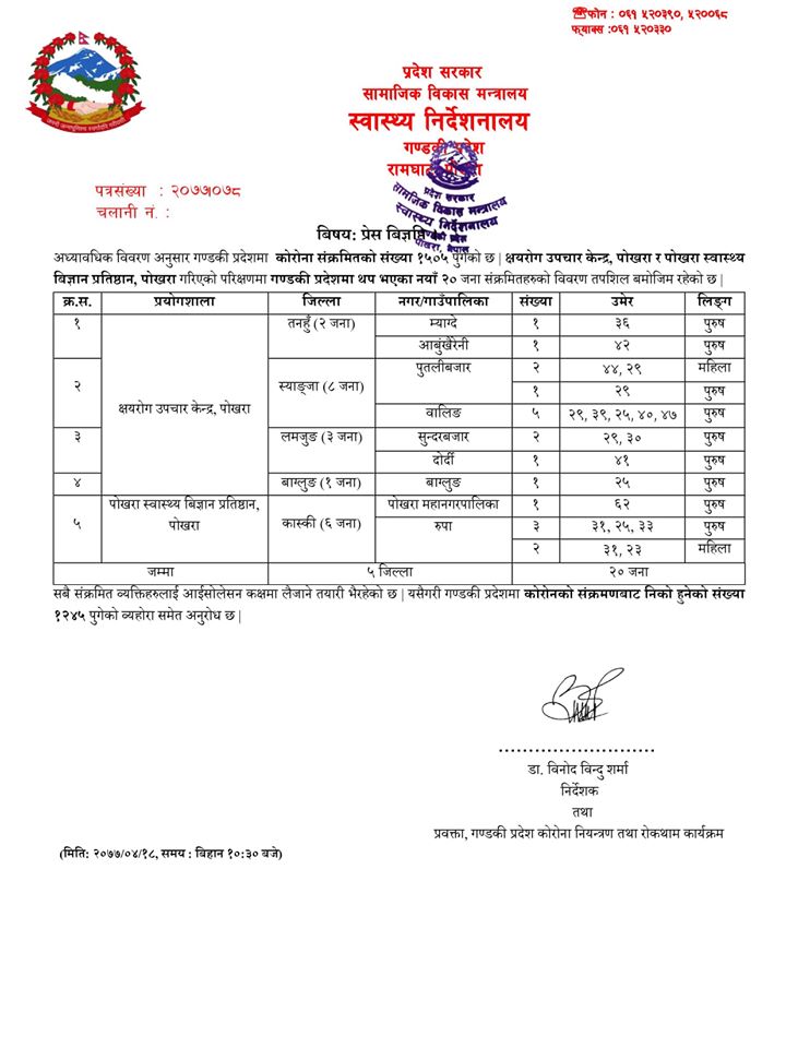 स्वास्थ्य निर्देशनालय गण्डकीले आइतबार बिहान प्रदेशको कास्की जिल्लाका ४ जना पुरुष तथा २ महिला, तनहुँका २ जना पुरुष, स्याङजाका ६ पुरुष तथा २ महिला, लमजुङका ३ पुरुष र बागलुङका १ पुरुषमा कोरोना भाइरस देखिएको जनाएको हो ।