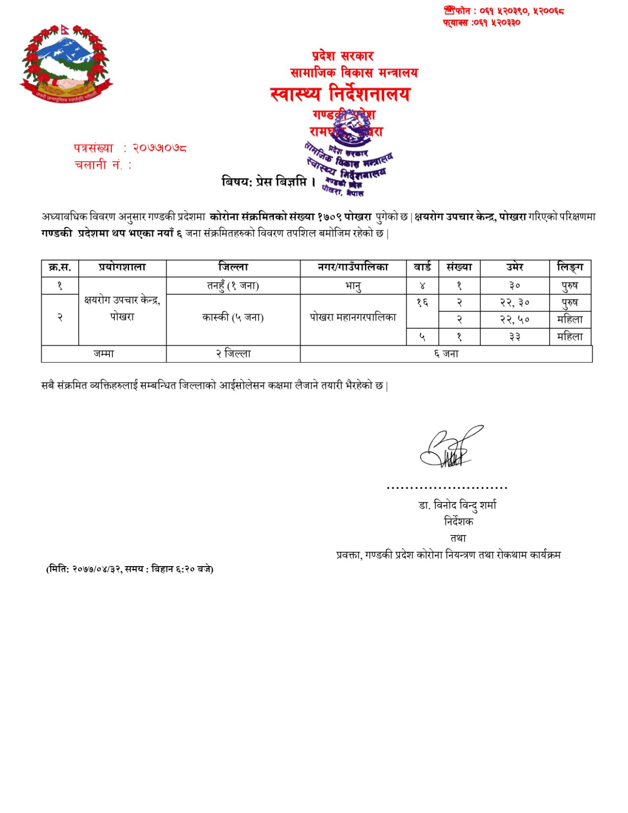 निर्देशनालयले बिहान ५ नं. वडाकी ३३ वर्षीया महिला तथा वडा नं. १६ का २२ र ५० वर्षीया २ महिला एवं २२ र ३० बर्षीय २ पुरुषमा कोरोना भाइरस देखिएको जनाएको हो ।